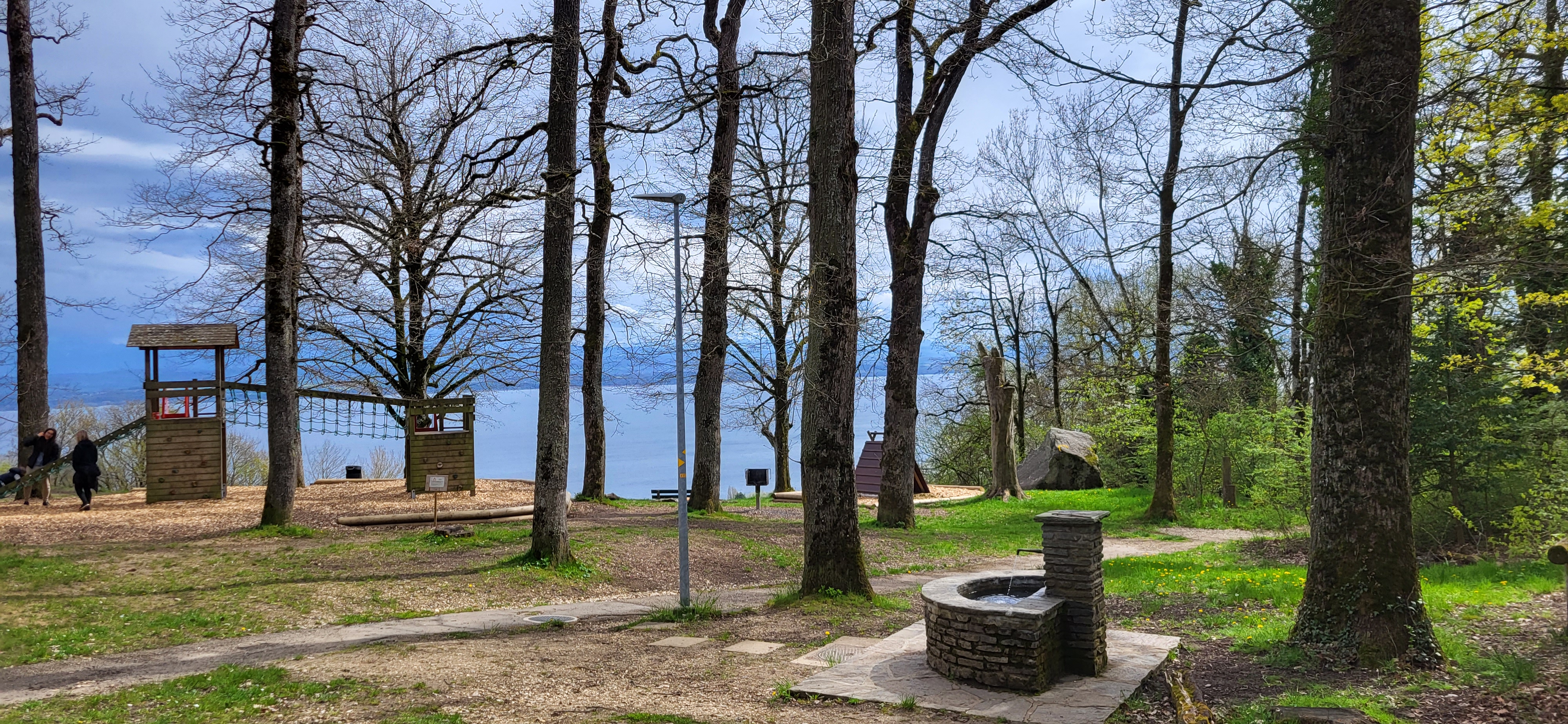 A partir du terrain de foot, sur toute cette seconde partie du parcours, un quizz des arbres a été installé sous forme de petits volets à soulever. On lit une description façon "Question pour un Champion" et il faut deviner de quel arbre il s'agit. On a la réponse en texte et en dessin au verso. Bien qu'on soit très nul en botanique, ça a bien boosté les enfants pour avancer. Une fois la forêt traversée, quand vous arrivez aux cibles du stand de tir, vous prenez à droite dans le carrefour. A la prochaine intersection, vous prenez à gauche et vous allez arriver à la buvette et place de jeux de Chantemerle. La promenade est quasiment terminée. C'est une véritable récompense pour les enfants qui peuvent jouer ET pour les parents qui peuvent se poser en terrasse avec une vue plongeante sur le lac de Neuchâtel. Il restera 400m en descente pour finir la boucle. Il faut emprunter un escalier sur la droite de la place de jeux. Il rejoint la rue de la Cure qui vous ramène au temple